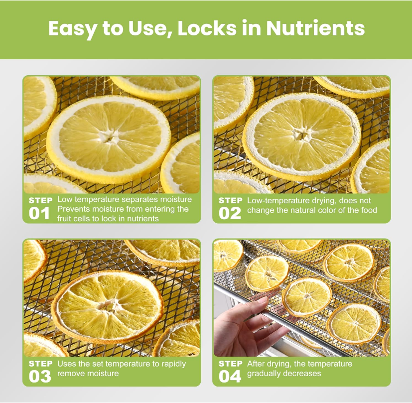 The large dehydrator has a mechanical knob control, which can be operated easliy. The temperature can be adjusted from 40-90℃. The time range is from 0-15 hours, with a normally open function, you can dehydrate all day with no timer. This large dehydrator must be a game changer of your business!