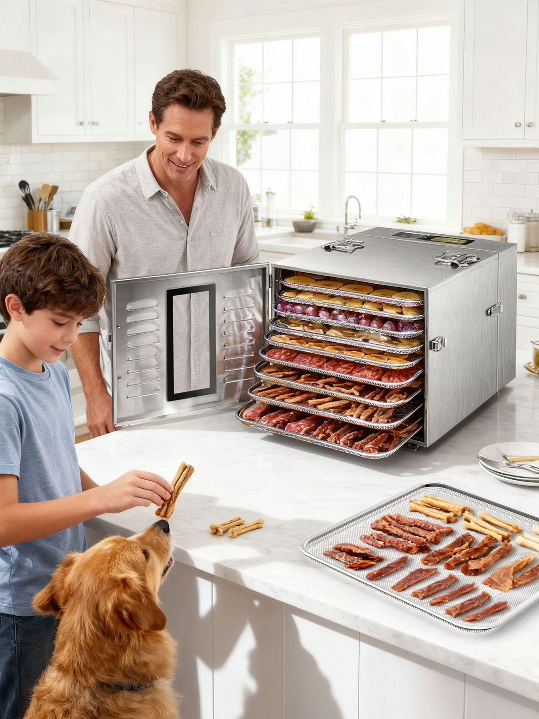 A home dehydrator is perfect for drying fruits, vegetables, herbs, meats, nuts, spices, and pet treats. It’s great for making healthy snacks or for food storage and pre-processing for the home.