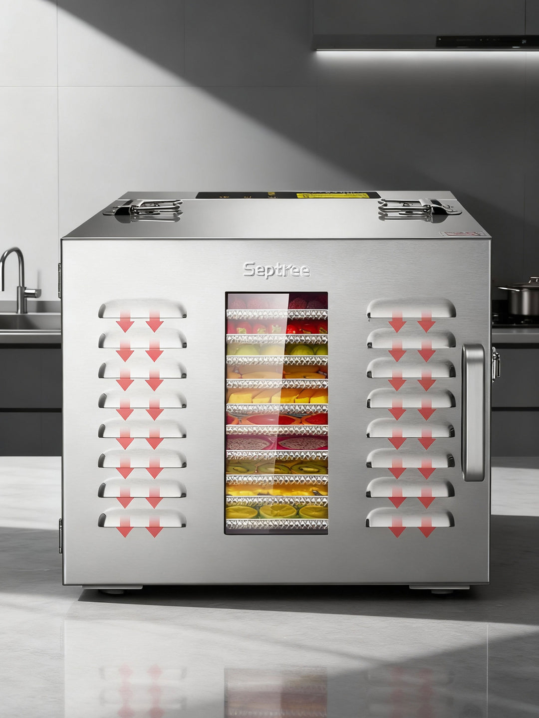 Made of Stainless steel with double row vents for improved water vapor discharge. Rear-mounted fan and air circulation ensure even drying. Transparent glass front door for easy monitoring.