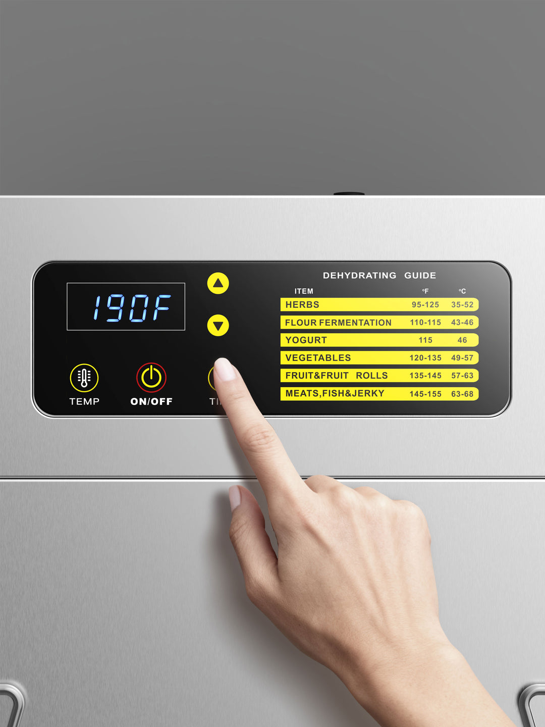 Adjustable thermostat(70°F-190°F) and touch panel timer(30-minincrements, up to 24 hrs) with auto