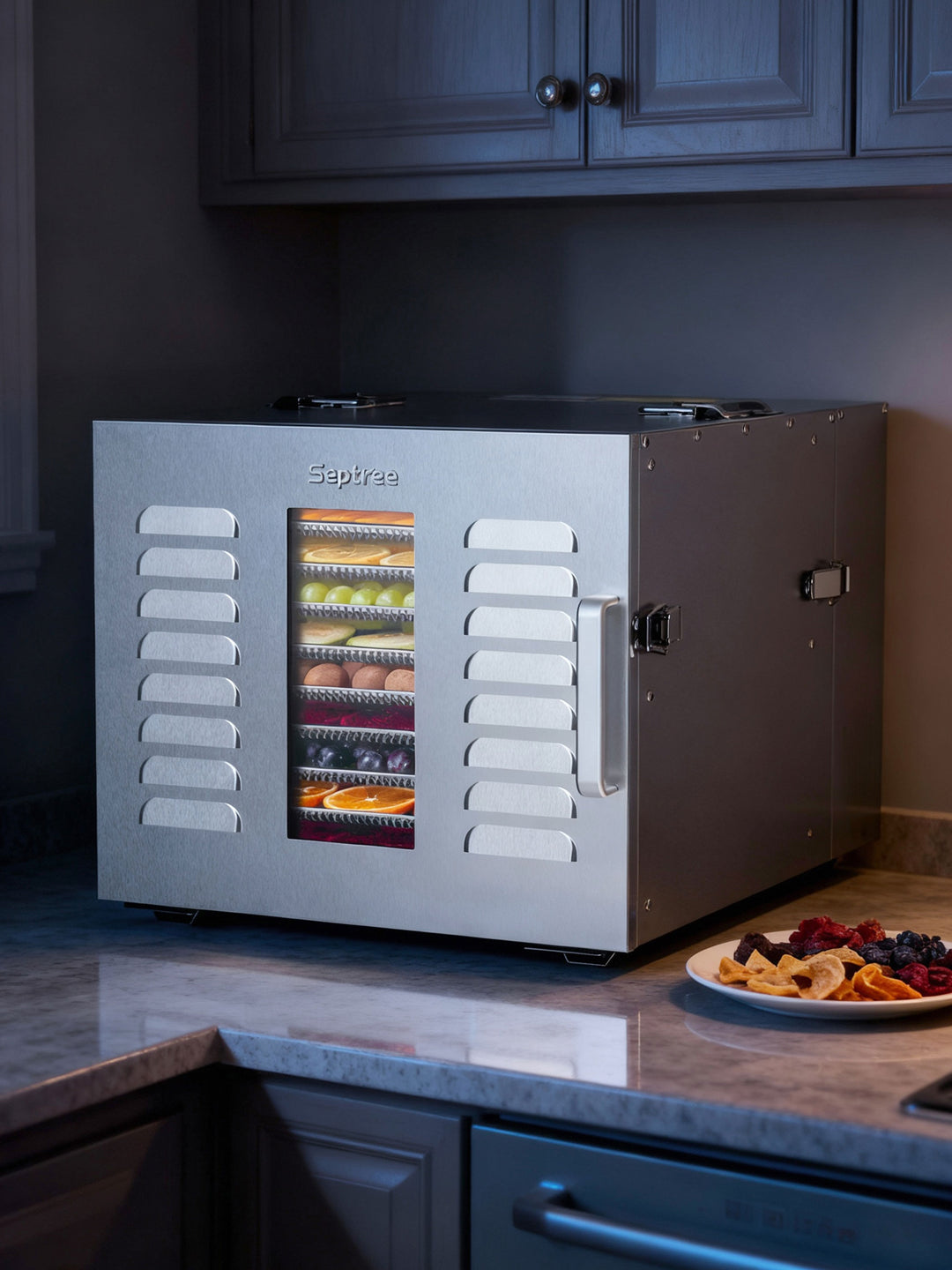 Quiet operation(45-50dB)won't disturb overnight dehydrating.Features auto shutoff and overheat protection.
