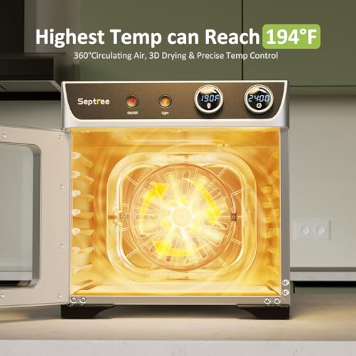 The Septree 8-Tray features dual exhaust vents and an advanced airflow design, distributing hot air evenly across all 8 trays, eliminating the need to rotate trays for consistent drying.