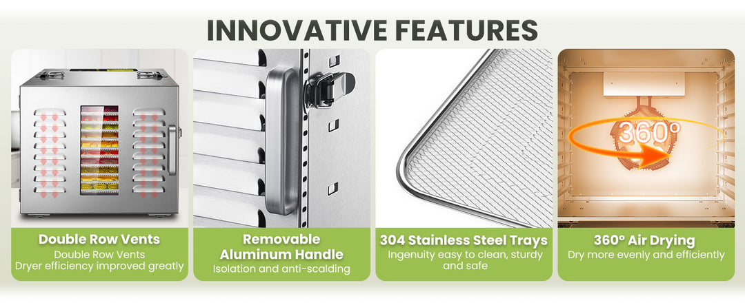 Made of Stainless steel with double row vents for improved water vapor discharge. Rear-mounted fan and air circulation ensure even drying. Transparent glass front door for easy monitoring.